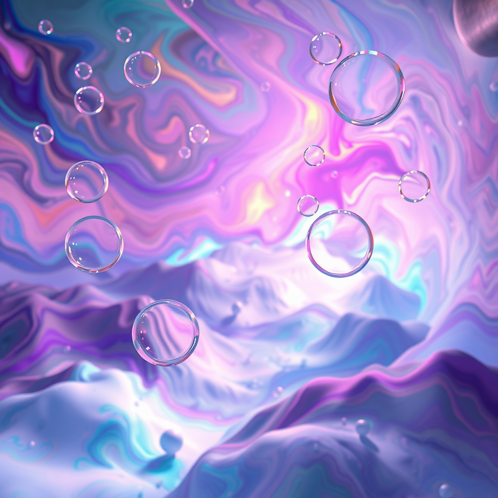 In the vibrant realm of Chromasphere, where bubbles float through a kaleidoscope of swirling hues, a whimsical world emerges, blending iridescent landscapes with spectral light.
