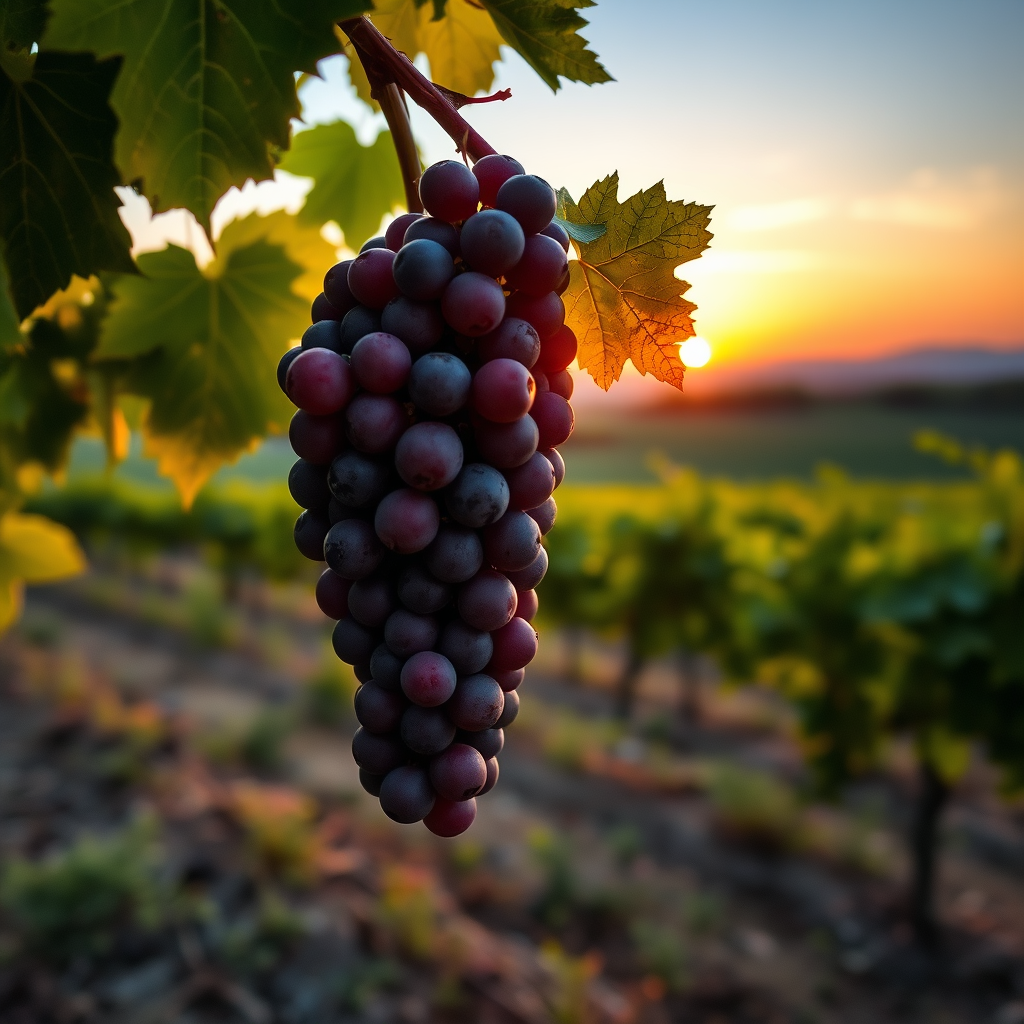 In the warm glow of a setting sun, an exquisite cluster of grapes hangs gracefully from a lush vine in a sprawling vineyard. The horizon stretches behind, capturing a breathtaking skyline that whispers of dusk. Every grape captures the intricate detail of its surface, glistening gently with the day's last light. The scene, reminiscent of an award-winning Phil Koch photograph, speaks to the serenity and bountiful beauty of nature, each element thoughtfully composed to showcase the vineyard's splendor.
