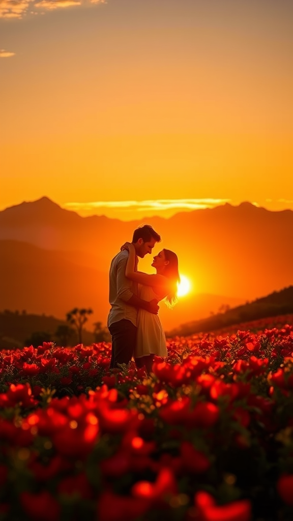 In the warm glow of sunset, a passionate romance unfolds amidst the spicy aroma of vibrant pepper fields, their silhouettes framed by the majestic backdrop of a serene mountain range.