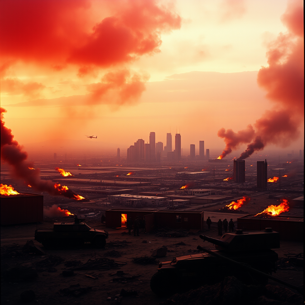 In this 70mm cinematic portrait, the background reveals a desolate, post-apocalyptic landscape where the remnants of Los Angeles sprawl across the horizon. The cityscape is consumed by flames, with charred military vehicles and crumbling skyscrapers contributing to the atmosphere of chaos and ruin. The sky is painted in shades of deep crimson, punctuated by thick, swirling smoke rising from the fiery wreckage below. The image is captured with masterful attention to detail, showcasing a high level of film grain that imparts a palpable, cinematic texture to the scene. The color palette is predominantly dark and subdued, interspersed with vivid bursts of fiery hues that heighten the drama and tension. This portrayal conveys an intense, gritty sense of action, evoking a powerful feeling of suspense and urgency that draws the viewer into the unfolding narrative.