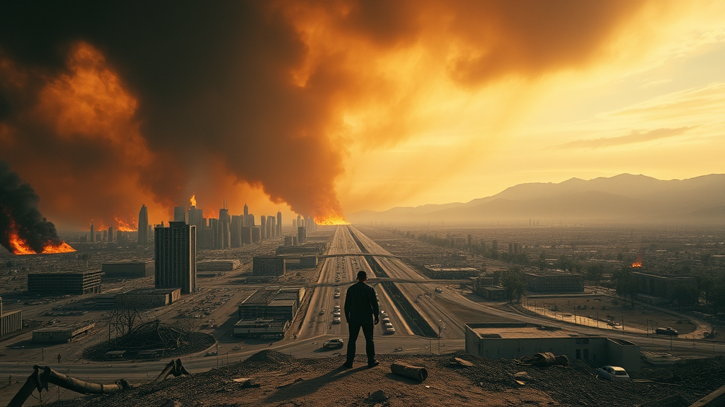 In this 70mm cinematic portrait, the foreground captures a solitary figure standing amidst a barren, post-apocalyptic landscape. The ruins of Los Angeles sprawl endlessly, skeletal skyscrapers and shattered highways tell tales of former grandeur. The horizon is a blazing inferno, where raging flames consume remnants of civilization. Charred vehicles and the debris of collapsed buildings punctuate the scene, heightening the chaos and devastation. The sky above is an ominous shade of molten orange, streaked with dark, swirling clouds that bleed soot and ash. Every detail is rendered with painstaking precision, enveloped in a heavy film grain that lends a raw, tactile feel. The color palette is somber and muted, yet punctuated by bursts of vivid, searing reds and oranges that intensify the drama and tension. The overall atmosphere conveys a gritty, high-stakes narrative, pulling the viewer into a world teetering on the brink, overwhelmed by a haunting mix of beauty and destruction.