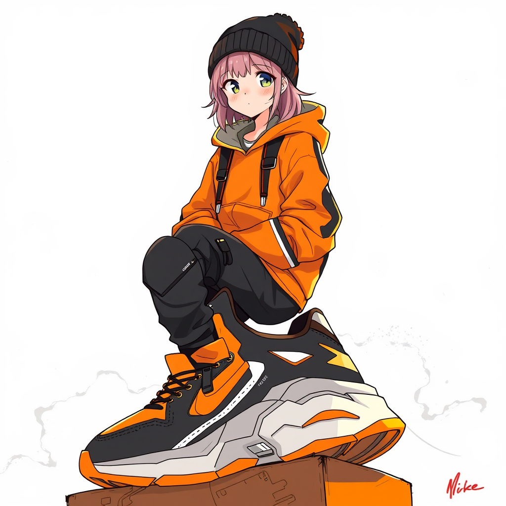 In this artwork, a girl is perched atop an oversized pair of sneakers in a captivating anime drawing style, echoing influences of ukiyo-e art. The piece, showcased on Tumblr, portrays her in a stylish ensemble comprised of a trendy beanie, a comfortable hoodie, and sleek workwear that embodies a techwear aesthetic. Her face, adorably anime-like, contrasts with her dynamic professional sports attire, creating a striking visual juxtaposition. The color palette is a bold and vibrant blend of orange and black, enhancing the edgy yet playful vibe. The artist, known as Mike, skillfully integrates elements reminiscent of Tsutomu Nihei’s style, while the girl's tech-inspired clothing subtly hints at a futuristic urban landscape.