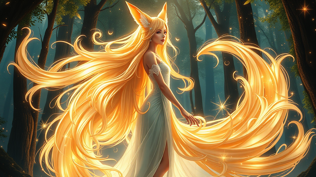 In this awe-inspiring masterpiece, a hyper-realistic image emerges, portraying the ultimate nine-tailed fox girl—a luminous being of enchanting beauty and strength. The artwork embraces hyper maximalism, with every element of the composition teeming with intricate details that capture the imagination. The nine-tailed fox girl stands elegantly within an enchanting forest, her graceful form emanating an otherworldly allure. Her flowing tresses cascade like molten gold, shimmering with an ethereal glow that reflects her celestial roots. Each hair strand is meticulously crafted, capturing the interplay of light as it dances across the silky waves.