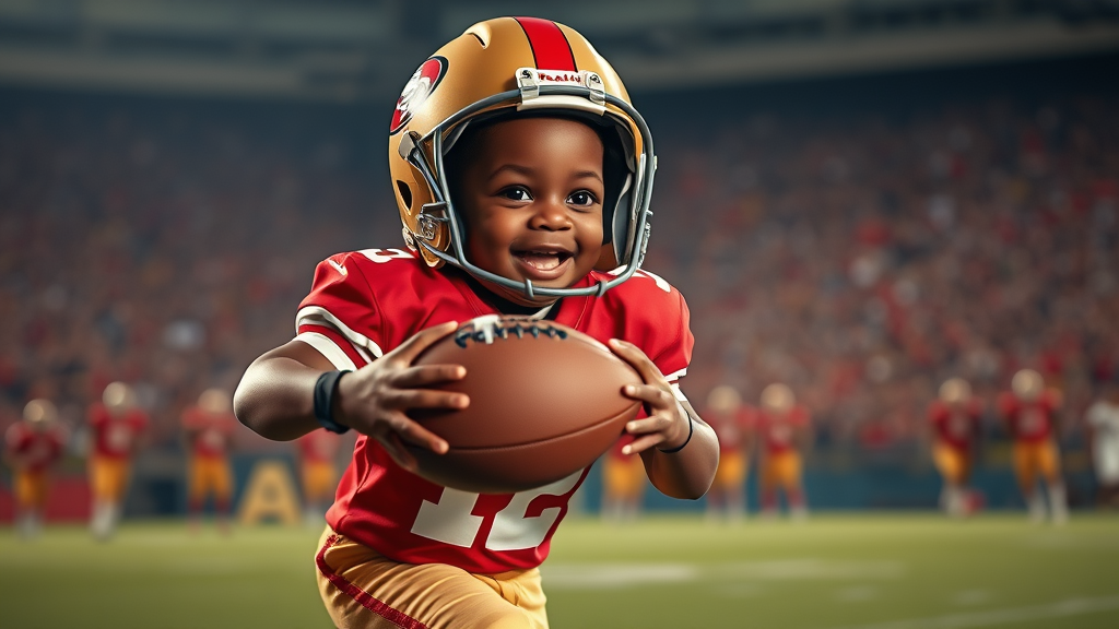 In this captivating scene, a young African American toddler dons the vibrant red and gold of the San Francisco 49ers uniform, complete with a helmet, as he dashes across the field. With bright eyes and a wide smile, he clutches the football securely, radiating pure joy and excitement as he scores a touchdown. The dramatic lighting highlights the dynamic pose, capturing the sheer exhilaration of victory in a hyper-realistic style. This HD render, reminiscent of a professional shot from a Canon EOS-1D X Mark III, embodies the thrill and spontaneity of the moment.