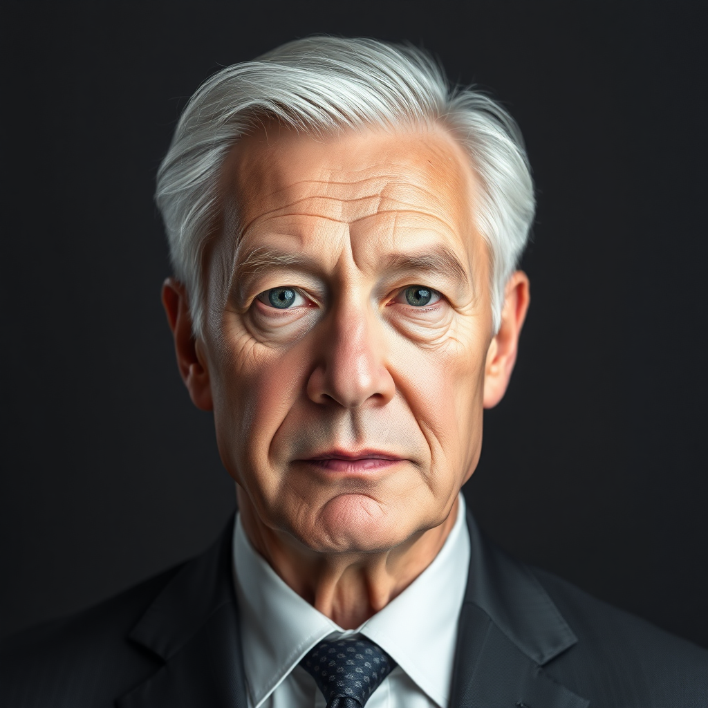 In this digital photograph, a middle-aged to elderly man, appearing to be in his late 40s to 60s, is the subject of a formal, photorealistic portrait. The photograph is high-resolution, with a sharp focus on the man's face, embodying a professional and timeless quality. Soft, diffused lighting from the front-left creates gentle highlights on his forehead, cheekbones, and the top of his hair, while subtle shadows on the right side enhance the contours of his face. The monochromatic color palette showcases a range of grayscale tones, with deep blacks in his suit, bright whites in his hair and shirt, and nuanced mid-grays providing depth. His expression is serious and intelligent, with a direct, thoughtful gaze that conveys a sense of focus. He possesses an oval to slightly rectangular face shape, complete with a broad forehead and a prominent jawline. His hair is light-colored, appearing white or very light gray, neatly combed, and parted on the left. It's thick with a slight wave to it. Almond-shaped, light-colored eyes are framed by medium-thick, straight eyebrows that match his hair color. A prominent, straight nose with well-defined features complements his face, while a broad, rounded chin features a slight cleft. His thick, well-groomed mustache, extending beyond the corners of his mouth, partially obscures thin, firmly set lips. The portrait captures the man's upper body, with his head, shoulders, and upper chest angled slightly to the right, but his face looking directly forward. He dons a dark, formal suit jacket of wool or similar fabric, paired with a light-colored collared shirt and a dark, possibly patterned necktie, secured with a decorative tie pin. A dark waistcoat might be visible beneath the jacket. The plain, solid-colored background, likely a medium gray, is softly blurred, ensuring the subject remains the primary focus. The overall atmosphere of the photograph is formal, dignified, and intellectual, instilling a sense of authority and scholarly presence.