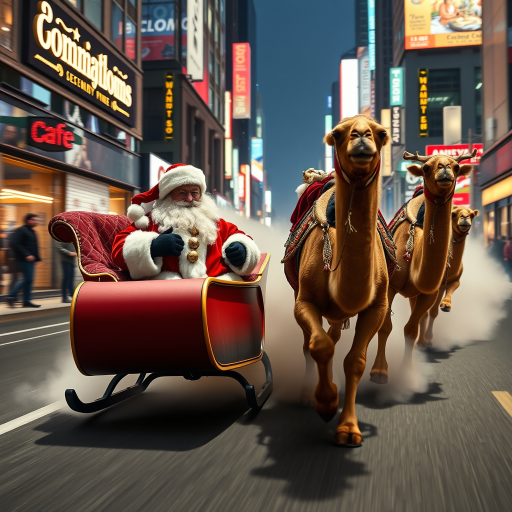 In this dynamic video sequence, Santa Claus and The 3 Wise Men embark on a thrilling race, with Santa's sleigh facing off against the 3 Wise Men's camels. The scene opens with a close-up, emphasizing the front of the sleigh and camels, capturing the sound of reindeer snorting and camels neighing in anticipation. As the camera pulls back to a wide shot, the full profile of the sleigh and camels is revealed, accelerating down a lively urban street at night. Smoke trails behind them as they perform a burnout, adding to the spectacle. The steady camera movement keeps pace with the sleigh and camels, showcasing an electrifying urban backdrop where neon lights from bustling storefronts and billboards reflect off the polished surface of the sleigh and the camels' ornate harnesses. The fast pace and seamless transitions between detailed close-ups and expansive wide shots enhance the excitement and cohesiveness of the scene, providing a captivating and imaginative blend of holiday tradition and modern thrill.