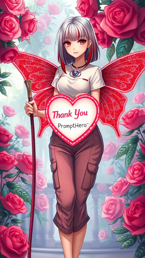 In this enchanting illustration, a gothic anime woman with striking silver and ruby-red hair exudes an Egyptian allure within a captivating garden. Her stylish yet modest wardrobe consists of a professional Gala T-shirt paired with a cargo pant dress, both featuring an elegant palette of red and white hues that highlight her athletic and well-designed beauty. She stands confidently, holding a large neon outline heart-shaped sign-staff marked with the words "Thank You PromptHero," her legs poised at a 45-degree angle. Her gaze is alluring, capturing the viewer's attention, while a ruby-diamond heart pendant necklace and oversized heart earrings add a touch of sophistication to her look. Complementing her enchanting appearance, she sports neon ruby-red and silver glittery butterfly wings that shimmer with a glassy finish. The background showcases an opulent garden brimming with vibrant neon black ruby glass roses, creating a stunning atmosphere of elegance and luxury, all captured in an illustrative painting using the default settings for Phoenix Mode, with slight creative modifications that maintain the core essence of the scene.