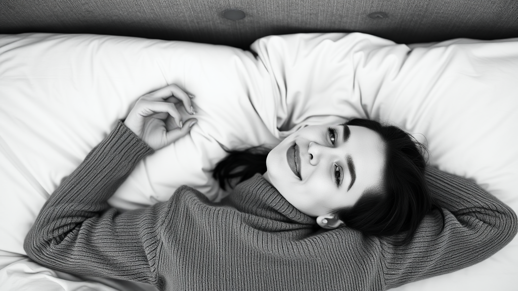 In this grayscale image, a young woman reclines on her back atop a comfortable bed. She sports short, dark hair and wears a cozy gray pullover. Her expression is serene and pleased, her gaze gently directed upwards with a tender smile playing on her lips. The lighting is soft and evenly spread, casting a cozy and welcoming mood. Absent are any stark shadows or striking light sources. The hues are understated, dominated by natural tones, emphasizing her as the focal point of the composition.