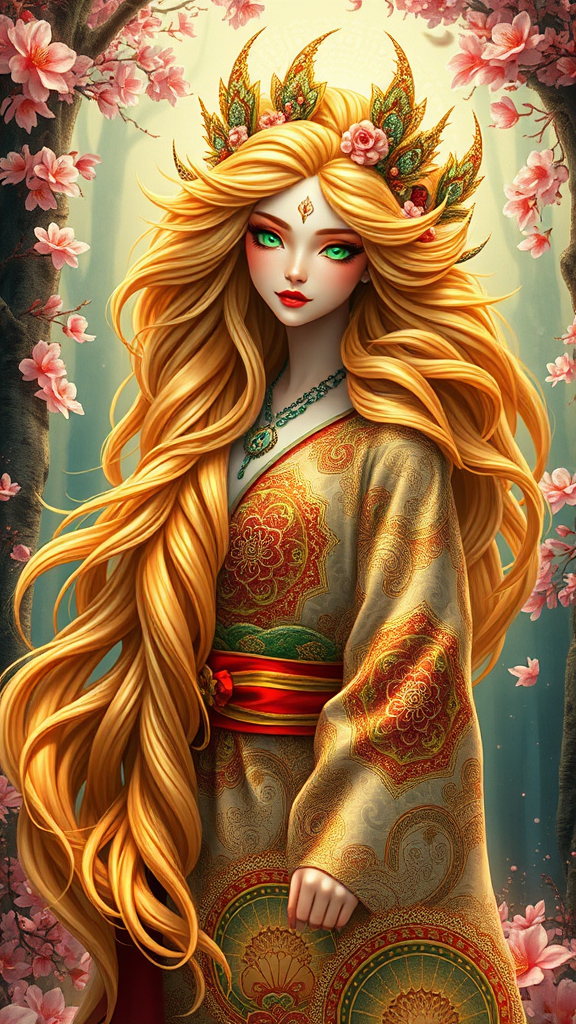 In this hyper-maximalist creation, an awe-inspiring vision of the ultimate emerges. She stands amidst a mystical forest, radiating ethereal grace. Her cascading locks, molten gold in hue, glimmer with a luminous inner glow. Her iridescent emerald eyes, filled with ancient wisdom and playful mischief, capture the heart. Her porcelain-like skin is adorned with intricate cherry blossom motifs that subtly shift with the light. Nine magnificent tails, each adorned with patterns inspired by a different art movement, create a harmonious visual melody. Her ornate kimono, influenced by traditional Japanese woodblock prints, displays exquisite detail. The enchanted forest bursts with brilliant colors, merging surrealism and fantasy. This epic artwork elicits awe, blending hyper-realistic rendering, intricate details, and a seamless fusion of styles. It is a groundbreaking testament to the artist's prowess, inviting viewers into a realm where beauty and magic coexist. With unmatched attention to detail, it transcends visual boundaries, offering a timeless encounter with the extraordinary nine-tailed fox girl—a stunning embodiment of artistic excellence.