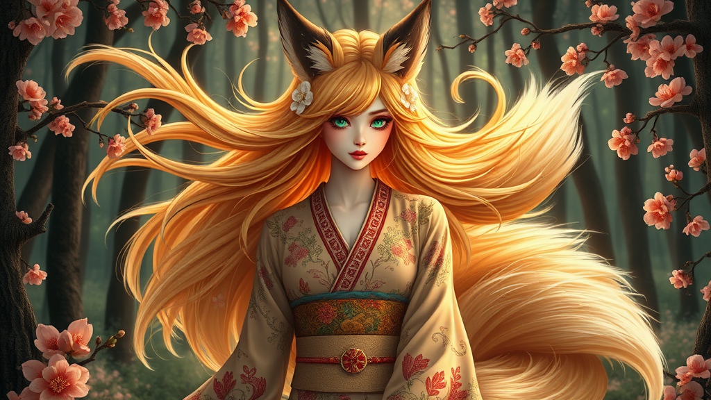 In this hyper-maximalist masterpiece, a breathtaking image of the ultimate nine-tailed fox girl emerges. She stands amidst a magical forest, radiating otherworldly grace. Her flowing hair, the color of molten gold, glows with an ethereal light. Her mesmerizing emerald eyes, holding ancient wisdom and playful secrets, captivate the viewer's soul. Her porcelain skin is adorned with intricate cherry blossom patterns that shift subtly with the light. Her nine magnificent tails, each decorated with designs inspired by diverse art movements, create a harmonious visual symphony. Her ornate kimono, echoing traditional Japanese woodblock prints, showcases meticulous craftsmanship. The enchanted forest bursts with vibrant hues, combining surrealism and fantasy. This epic masterpiece evokes awe, intertwining hyper-realistic rendering, intricate details, and a seamless fusion of styles. It stands as a groundbreaking testament to the artist's skill, inviting viewers into a realm where beauty and magic coexist. With unparalleled attention to detail, it transcends visual boundaries, offering a timeless encounter with the extraordinary nine-tailed fox girl—a stunning embodiment of artistic excellence.