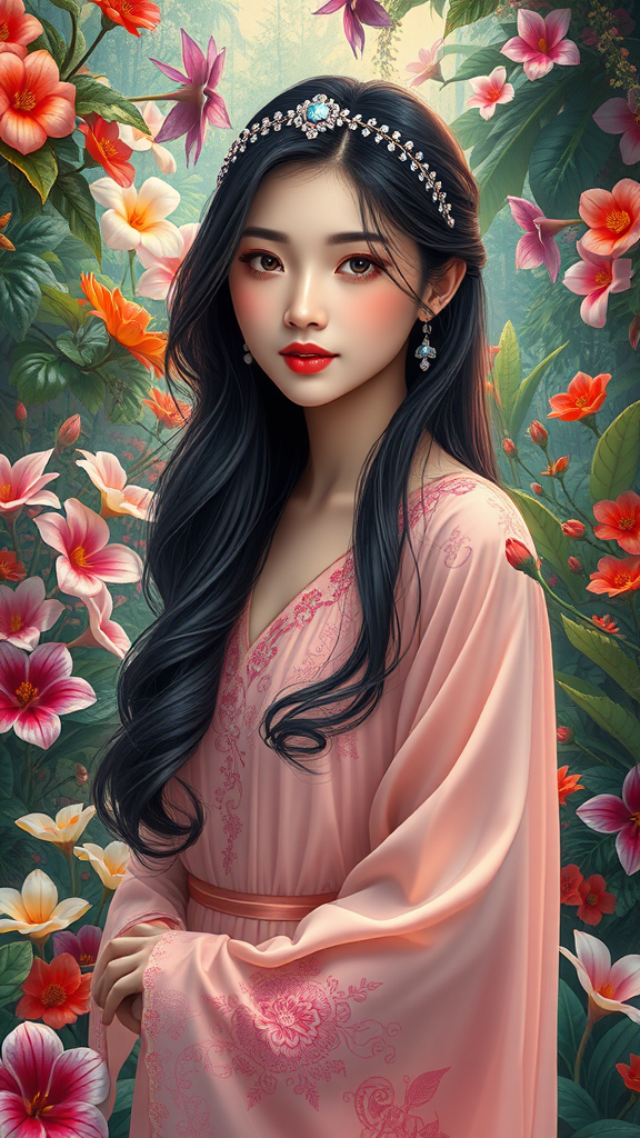 In this hypermaximalist artwork, we see a young Asian woman standing in a vibrant garden, surrounded by an array of blooming flowers and exotic plants. Her skin emits a gentle, inner glow, enhancing her serene presence, while her long, dark hair drapes elegantly in soft waves. She is dressed in a flowing gown with intricate embroidery, complemented by a delicate headband adorned with shimmering jewels. The garden is teeming with life, with rich colors and textures, creating a sense of an otherworldly paradise that envelops her in its embrace.