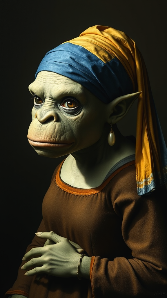 In this imaginative scene, an ogre sits poised like a timeless muse, capturing the essence of Vermeer's classic style. The creature's muted green skin is bathed in gentle, natural light that cascades from an unseen source, mirroring the masterful chiaroscuro of the original. The ogre's eyes, though larger and more expressive, carry a depth and curiosity akin to Vermeer's maiden. Its gnarled, yet intriguing features are softened by the drape of a deep blue and golden yellow turban, echoing the iconic headdress. A single, lustrous pearl earring dangles from its oversized ear, a subtle nod to the elegance that transcends its monstrous visage. The backdrop is a simple, dark shadow, allowing the subject's features and adornments to captivate the onlooker, blending Vermeer's delicate style with a touch of whimsical fantasy.