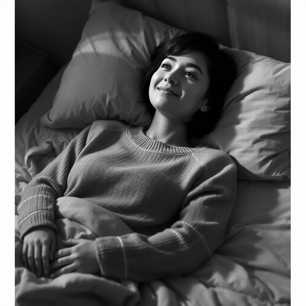 In this serene black and white image, a young woman with short dark hair reclines comfortably on a bed, clad in a cozy gray sweater. Her demeanor is calm and serene, accompanied by a gentle smile as she looks upwards. The lighting is soft and diffuse, casting a warm, inviting glow across the scene. There are no stark shadows or intense light sources present. The muted color palette features soothing earth tones, placing the woman firmly at the center of attention.