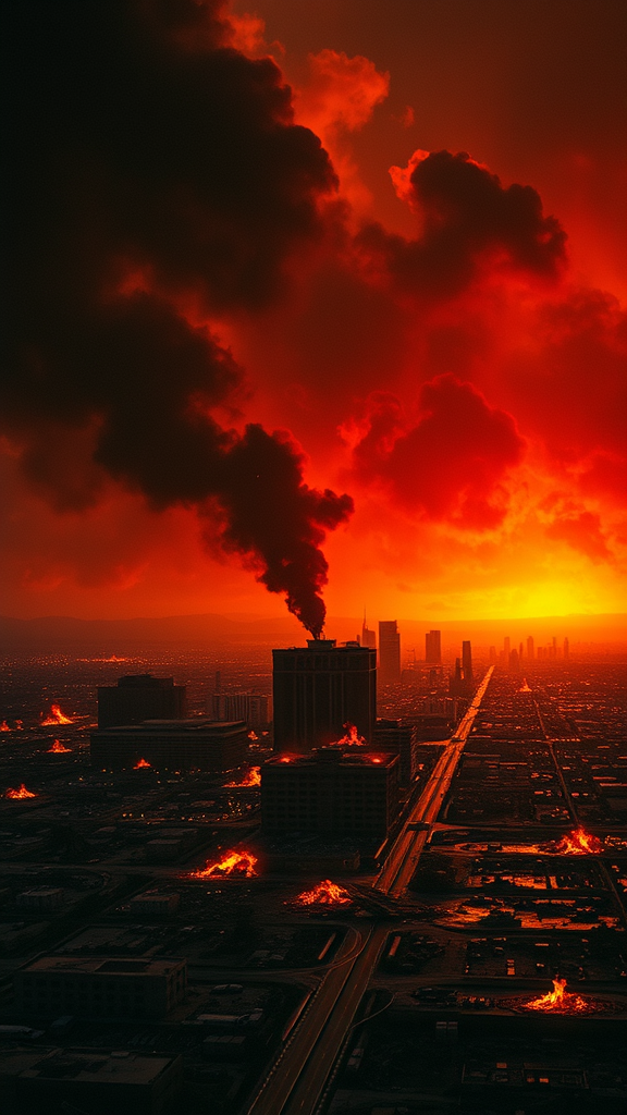 In this sweeping 70mm cinematic portrait, a background of a devastated, post-apocalyptic landscape reveals the skeletal remnants of Los Angeles stretching towards the horizon. Infernos consume the skyline, with molten wreckage of vehicles and crumbling structures heightening the sense of destruction and turmoil. The sky looms with a deep, foreboding crimson, as thick, charcoal clouds of smoke ascend ominously from the blazing metropolis. Captured in exquisite detail, the image features a heavy film grain and rich texture, imbuing it with an immersive and tactile quality. Muted darkness dominates the color palette, punctuated by vivid, fiery bursts that intensify the scene's drama and volatility. The overall effect is one of gritty, adrenaline-fueled action, layered with an atmosphere of profound drama and suspense, drawing the viewer irresistibly into the unfolding chaos.