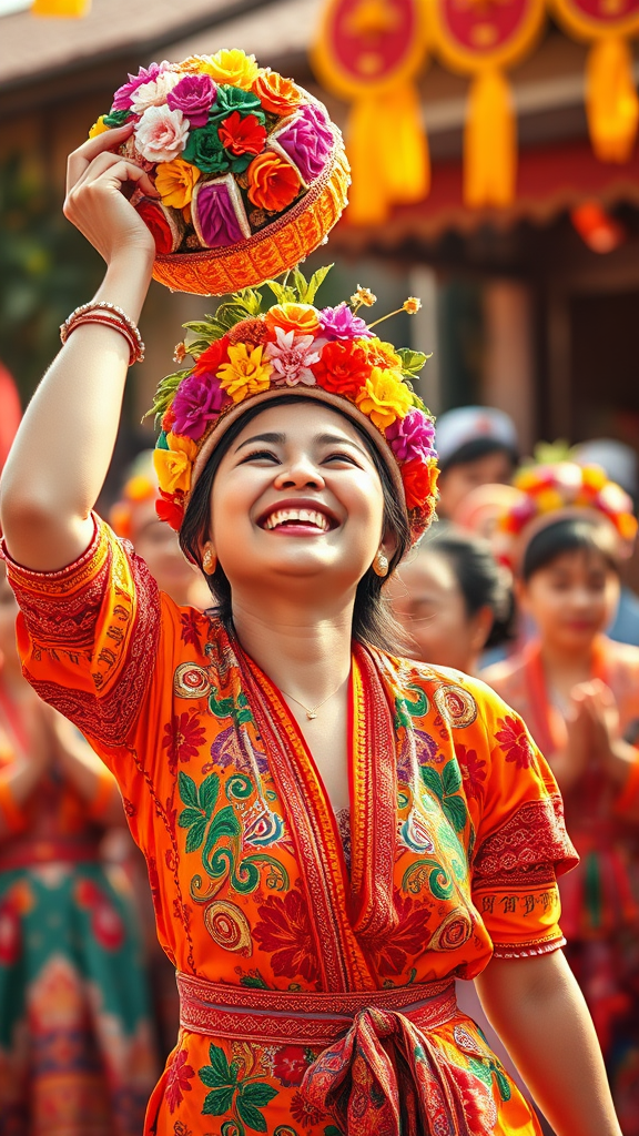 In this vibrant scene, a joyful woman is at the center, dressed in traditional attire renowned for its vivid colors and elaborate designs. Her outfit is richly adorned with bright, intricate motifs and delicate embellishments, while a headdress, bursting with an array of colorful flowers, crowns her head. She is holding aloft a beautifully crafted object, likely a central feature of a cultural festival or celebration, her face lit up with exuberance and pure delight. Her eyes are closed and her head is tilted back in laughter, capturing a moment of genuine happiness and immersion in the event. In the background, figures garbed in similarly traditional clothes, though slightly blurred, can be seen partaking in the festivities, hinting at a lively communal gathering. The warm, golden lighting enhances the celebratory atmosphere, imbuing the image with a dynamic and joyful energy.