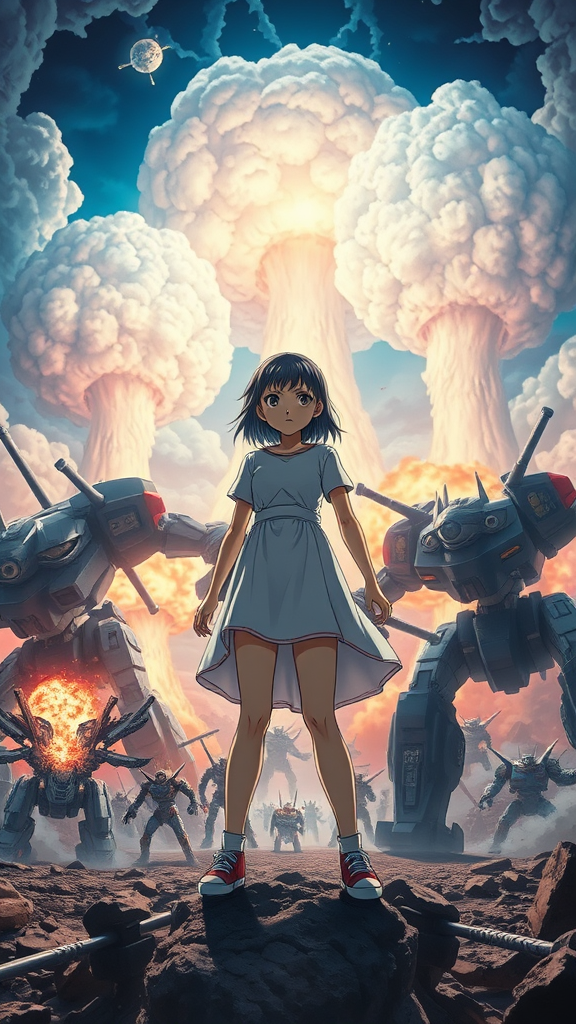 In this visually stunning movie poster, an incredibly powerful anime girl stands at the center, exuding an aura of strength and grace. Imagined by the legendary creators Hideaki Anno, Katsuhiro Otomo, and Rumiko Takahashi, this masterpiece blends storytelling with unforgettable visuals. The poster captures the excitement of a box office hit, depicting an epic battle where colossal monsters and high-tech mech creatures clash with ferocity. Bright nuclear explosions illuminate the sky, casting an eerie glow over the scene, adding depth and drama. This highly detailed 8k image highlights the main character's determination and power, promising an unparalleled cinematic experience.
