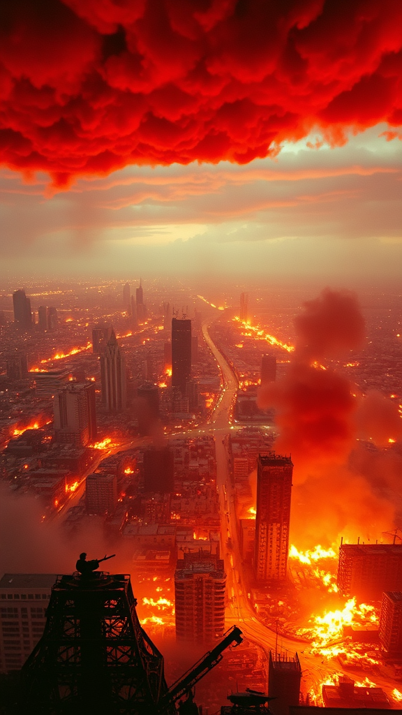 In this vivid 70mm cinematic portrait, the backdrop reveals a sprawling, post-apocalyptic panorama, with the skeletal remains of Los Angeles extending endlessly. The cityscape is consumed by roaring flames, as smoldering tanks and crumbling skyscrapers punctuate the atmosphere of chaos and ruin. Overhead, the sky is a tempestuous, fiery crimson, with dense, swirling clouds of soot rising ominously from the engulfed metropolis. The image is captured in stunning detail, with pronounced film grain and texture that imbue it with a tangible, cinematic feel. The color scheme is predominantly dark and subdued, accented by bursts of intense, blazing hues that heighten the scene's drama and urgency. The overall impact is one of raw, dynamic action, weaving a narrative of deep drama and tension that magnetically pulls the viewer into the unfolding devastation.