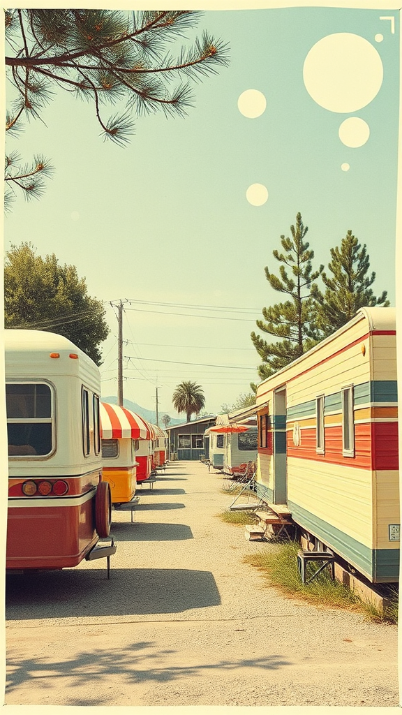 Incorporating elements of double exposure and close-up medical illustrations, imagine a scene set in a trailer park by the beach, where industrial and fine arts motifs overlap with uneven rows and grid patterns. Envision extreme screen prints with faded images, white space, and large pictures that are cut and off-center, resembling taped negative spaces. The composition features split images, blank spaces, and circles, evoking a vintage feel akin to Shepard Fairey's style, reminiscent of a carnival poster. The color palette is a vibrant overprint of light blue, red, brown, yellow, and green, with pine trees adding an organic touch.