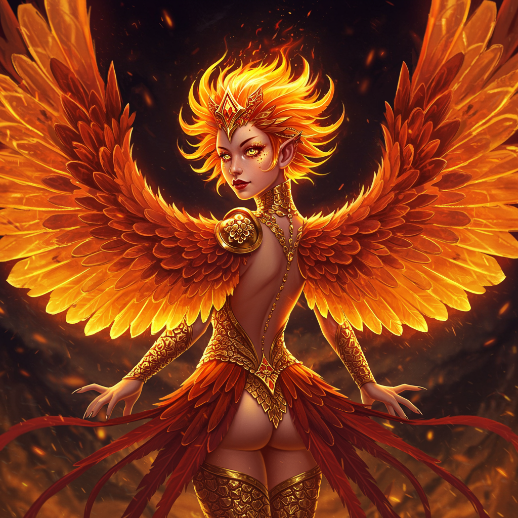 Incredible full-body portrait of a Firebird girl merging gold and fire, her fractal hair and feathers emanating an enigmatic and flirty smile. Captured under acid lighting from below, this hyper-detailed and hyper-realistic depiction showcases a stunning amalgamation of intricate detailing and surrealism. She is adorned in a complex, chaotic diamond outfit with gold colors and ornate art deco patterns. Her inquisitive soul is reflected in her hypnotic, reflective eyes, reminiscent of Bayard Wu and Amr Elshamy's artistic influence. The scene is an epic action portrayal viewed from the back, drawing inspiration from Ognjen Sporin, with subtle yet captivating variations added.