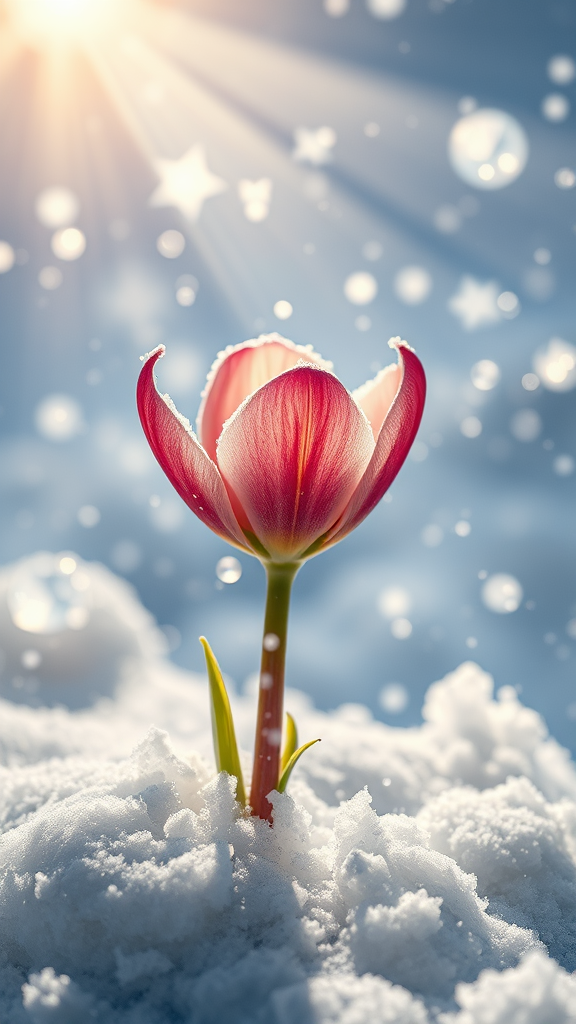 Incredible hypermacro photograph capturing a delicate yet vibrant spring flower emerging defiantly through a swirling blizzard. Sunbeam rays dance and illuminate the intricate petals, heralding the arrival of springtime. Imagined in a style reminiscent of fantasy epics, this composition is captured with the renowned detail of the Hasselblad H4D 200MS Digital Camera paired with a Mitakon Speedmaster 300mm f/4 XCD. The scene is bathed in epic, dynamic lighting, invoking a sense of awe and renewal against the backdrop of harsh winter elements.