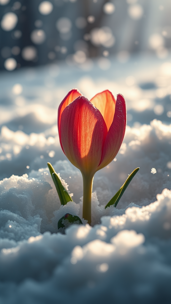 Incredible hypermacro photograph of a vibrant spring flower with intricate petals emerging from a blanket of snow amidst a fierce blizzard; sunbeams gently illuminating the scene, heralding the arrival of spring. Captured in a style reminiscent of fantasy epics, using a Hasselblad H4D 200MS Digital Camera paired with the Mitakon Speedmaster 300mm f/4 XCD lens, the composition features dramatic lighting that highlights the delicate resilience of nature.