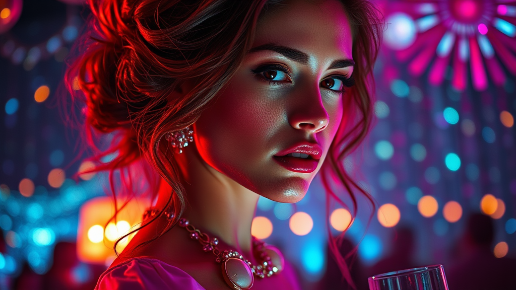 Incredible portrait of an enchanting woman immersed in the heart of a celestial night celebration within the sophisticated realm of adulthood, dripping with sultry elegance, extremely intricate and richly detailed, bursting with vibrant hues, enveloped in volumetric lighting, cinematic appeal and photorealism, sharp focus, smooth textures, depth of field, echoing Saul Bass' vision, captured using a Hasselblad camera, 85mm lens at f/1.4 aperture, 1/500 shutter speed, ISO 100, shot in RAW format, UHD, 32k resolution.