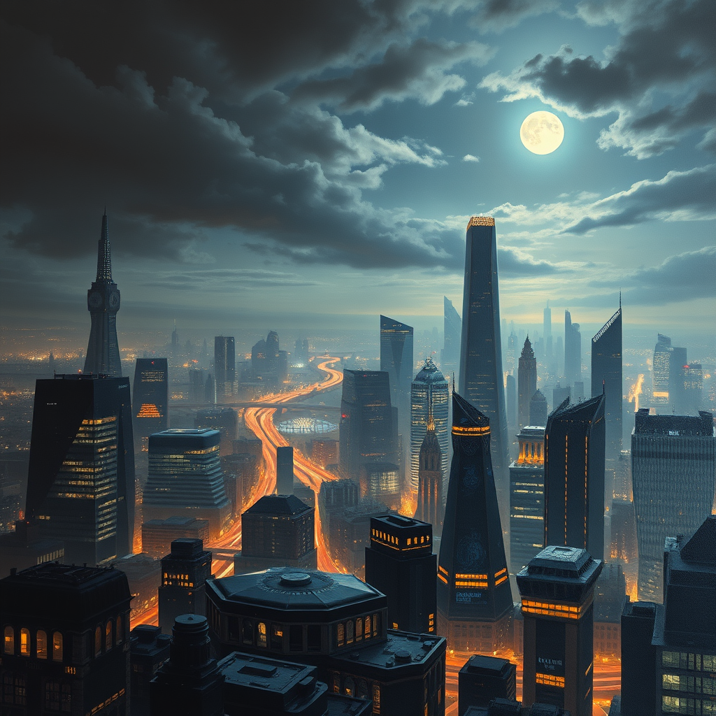 Incredible ultra-detailed cityscape of a futuristic landscape at moonlit night, capturing the essence of a classic oil painting, high angle perspective, very close-up view, meticulously balanced composition, showcasing incredible depth of scene, echoing inspirations from a future vision of London, suffused with voluminous diffused light and subtle backlighting, exhibiting smooth transitions of paint and striking reflections on various surfaces, rendered with octane quality, featuring the highest quality textures and intricate details, enveloped in a mystical sky and atmosphere under the moonlight, drawing inspiration from the finest modern landscape painters, maintaining a flawless finish free from any deformities, noise, or distortions, with precise anatomy and accurately rendered features.