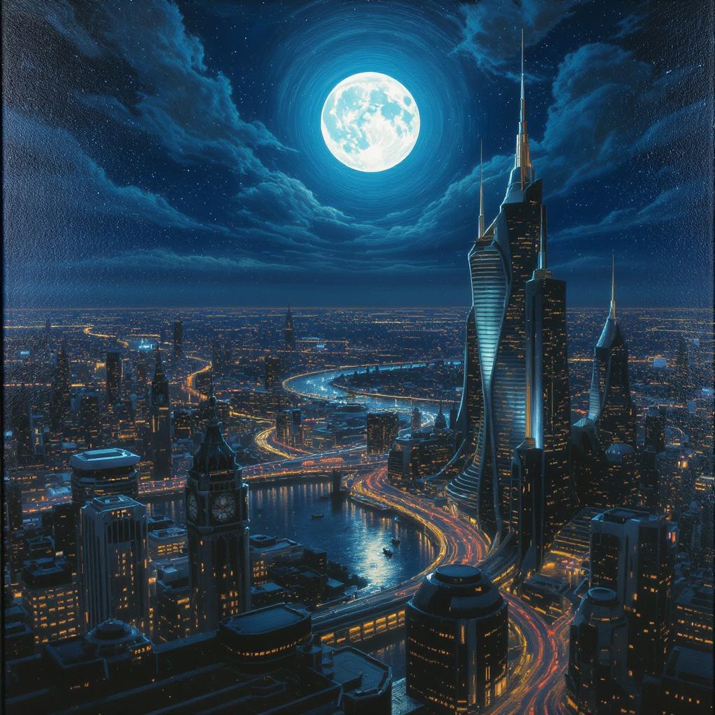 Incredible ultra detailed cityscape of a futuristic metropolis under the glow of moonlight, portrayed in the style of a classic oil painting. Captured from a high angle with an intimate, close-up perspective, the composition is meticulously balanced, revealing the depth of the scene. Inspired by visions of future London, the cityscape is illuminated by voluminous and diffused light with dramatic backlighting. Smooth transitions of paint bring the scene to life, showcasing reflections on sleek surfaces, akin to octane rendering, ensuring the highest quality textures and intricate detail. The city is enveloped in a mystical atmosphere, with the moonlight casting a serene glow across the skyline. This composition is inspired by the best of modern landscape painting, embodying seamless paint transitions and peerless texture quality, capturing the intricate intricacies of a utopian urban future.