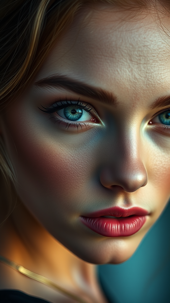 Incredibly detailed, cinematic film grain, high-quality elegant outcome, striking makeup, sophisticated studio setting, intense closeup, direct gaze, poised, exceptionally beautiful, tasteful artistic expression, ultra-high resolution, mesmerizing blue-green eyes.
