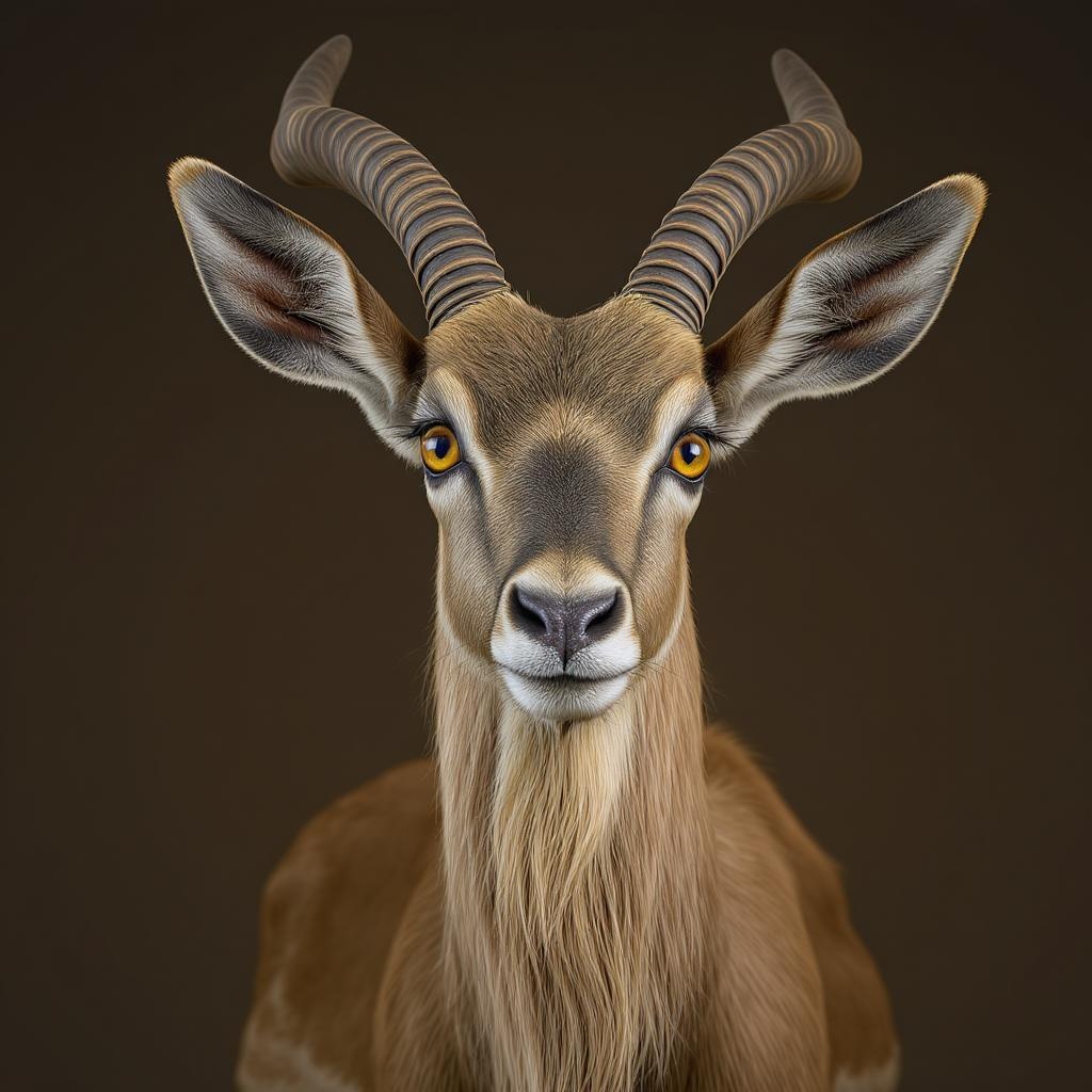 Incredibly detailed studio portrait of a stunningly beautiful saiga antelope with angelic features, casting a playful, mischievous glance at the camera through its striking amber eyes. This hyper-realistic photograph captures the intricate textures and fine details of the antelope's features, accentuated by a soft rim light that enhances its ethereal presence. Shot with a Canon DSLR at f/2.8, the image blends the photographic artistry of Felix Kunze and Annie Leibovitz with Pratik Naik's expert retouching, resulting in an ultra-refined, photorealistic masterpiece. The antelope's poised yet cheeky demeanor adds a layer of whimsical charm to this exquisite portrait.