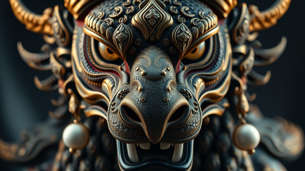 Incredibly intricate close-up portrait of a fierce singha, gazing directly ahead, adorned with elaborate details, ultra-realistic depiction, inspired by Thai mythology, dragoncore elements, wearing a luminous pearl earring, enchanting realism, styled with a cosmic essence, hyper-detailed, breathtaking composition, dramatic lighting, at 32k, uhd resolution, captured with Hasselblad H6D-400c Multi-shot, using Mitakon Speedmaster 65mm f/1.4 XCD --c 10 --q 3 --ar 4:5 --s 750 --v 5. 1.