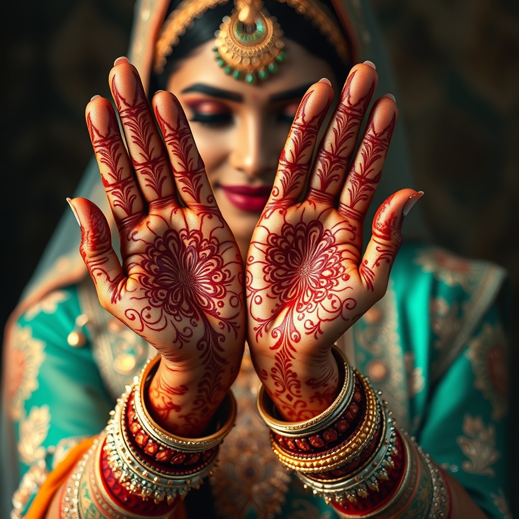 A stunning Indian bride adorned in exquisite traditional attire displays her elegantly henna-decorated hands, captured in a photorealistic and ultra-detailed manner. The image boasts a hyperrealistic quality, utilizing a wide-angle lens reminiscent of a 70mm film shoot. The scene is enriched with high-contrast shading, featuring Indian-inspired motifs in a palette of deep amber and emerald, dark turquoise and brown, vibrant orange and emerald, and rich crimson and turquoise. The composition is presented in high definition, capturing the intricate beauty and cultural essence of the moment.