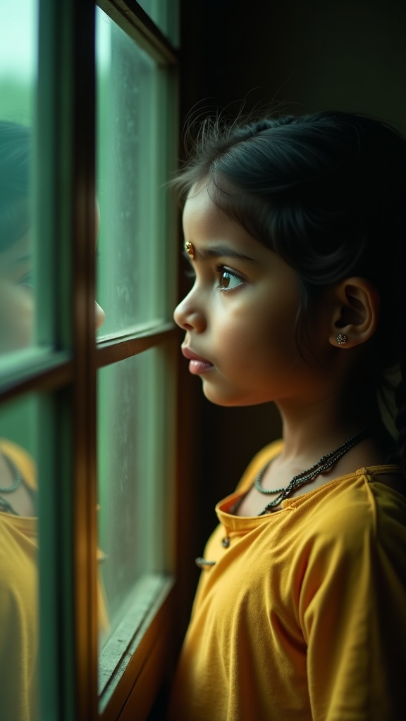 A young Indian girl with a distinctive nose gazes thoughtfully out the window, the scene captured in manipulated photography. Her reflection mirrors in the glass, creating a symmetrical composition reminiscent of an image on Flickr. The photograph, taken with a Hasselblad 1600f, bathes her in the soft glow of emerald and amber hues, evoking a romantic emotion that is both nostalgic and hopeful.