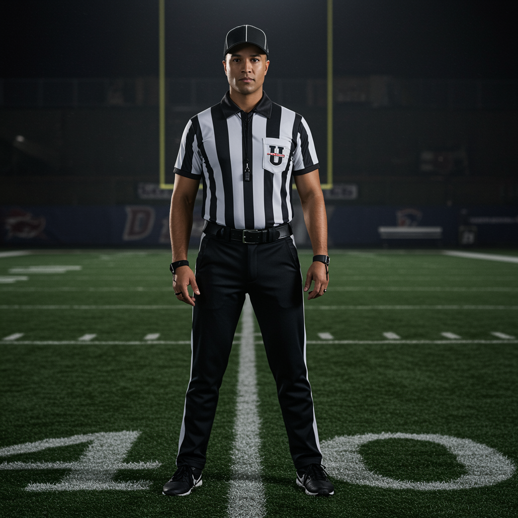 An attractive individual dressed as a football referee stands confidently on a football field, centered and looking directly at the viewer. This portrait, captured in high-resolution photography, showcases detailed skin and features in a realistic, photo-realistic manner. The scene is illuminated with diffused soft lighting, employing a shallow depth of field and sharp focus to emphasize hyperrealism. The setting is further enhanced by cinematic lighting and CGI effects, giving it a crisp, 3D quality. The composition maintains high detail with RAW color art, set against a softly blurred background to draw attention to the subject. The image avoids any low quality or distorted elements, ensuring perfect anatomy and proportions, while eliminating distractions like text, artifacts, or unwanted marks.