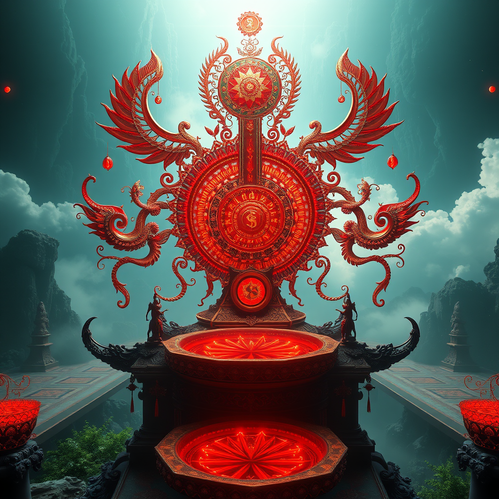 Indonesian digital art marvels, intricate symbolism, mesmerizing illusions, crimson hyper-realism, 4D depth, breathtaking detail, cinematic ultra-realism, unparalleled quality, vertical panorama aspect ratio 9:21