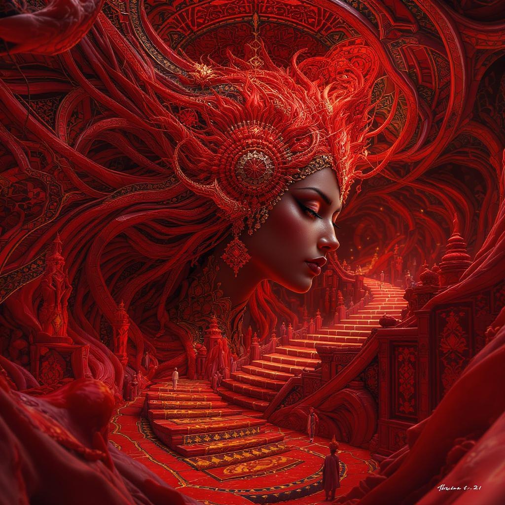 Indonesian-inspired digital art marvels with intricate symbolism and illusionary compositions. Hyper-detailed, ultra-realistic, and cinematic art pieces in striking red hues. A mesmerizing journey through a 4-dimensional realm, where hyper-realism meets highest quality detail and craftsmanship. Ratio 9:21.