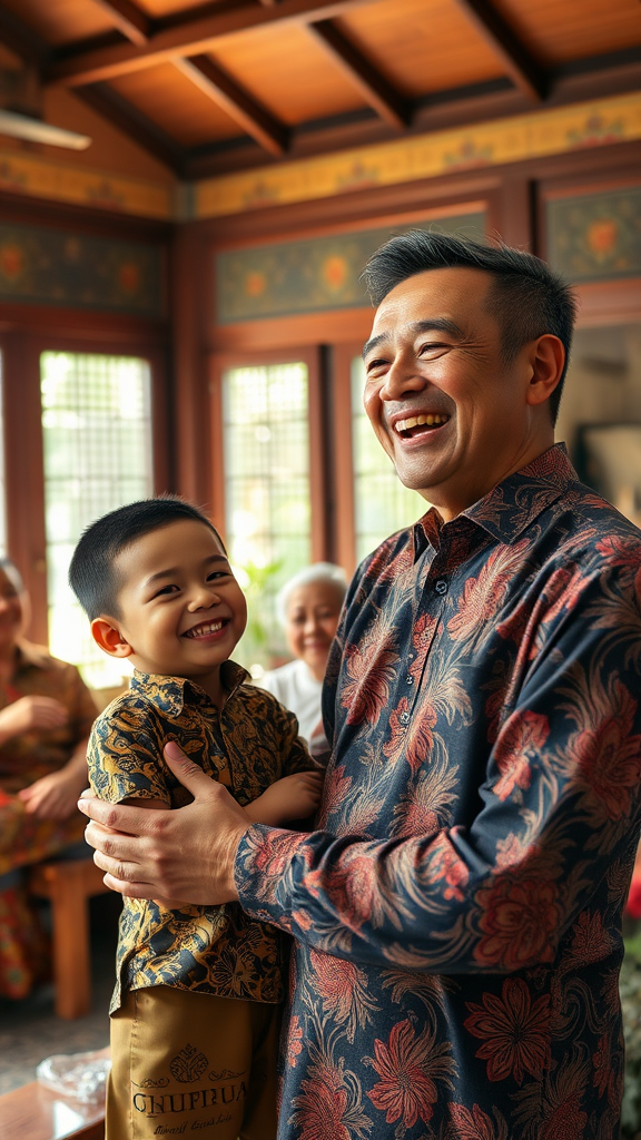 Indonesian man in his 30s, wearing a finely detailed batik shirt, laughs heartily as he assists his young son in a bustling, vibrant traditional living room. The room is alive with the sounds of morning, filled with the warm, natural light that streams through large windows. Other family members are gathered around, their faces lit up with genuine smiles, each dressed in exquisitely detailed traditional garments that reflect the vivid colors and patterns of their culture. The atmosphere is one of warmth and connection, with intricate facial expressions capturing the essence of a joyful family moment, reminiscent of a scene from a cinema camera aesthetic with a naturalistic, candid feel.