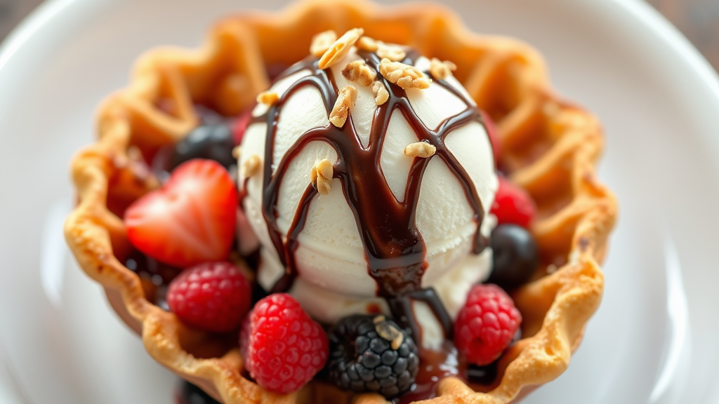 Indulge in a velvety scoop of rich ice cream nestled within a crispy half-moon waffle bowl, artfully adorned with a medley of fresh berries and a drizzle of luscious chocolate syrup, crowned with a sprinkle of roasted nuts for an added crunch.