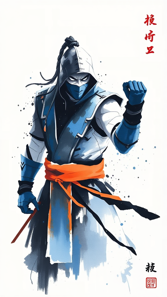 View this AI-generated image featuring a minimalist ink artistic depiction of sub zero from mortal kombat featuring abstract elements and dynamic typography utilizing complementary colors the composition embodies the fluid elegance of chinese painting set against a crisp white background capturing t