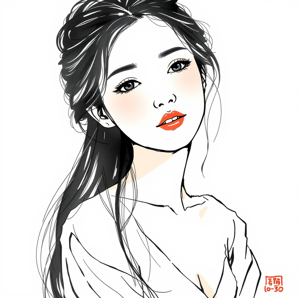 Ink illustration of a serene Korean woman, aged 25-30, embodying traditional Asian beauty ideals, featuring soft, flowing lines that capture grace and elegance. The composition emphasizes harmonious proportions and delicate features, framed by an expression of quiet confidence. With an element of gentle spontaneity, the artwork integrates subtle, abstract flourishes to evoke a sense of fluidity and modernity.