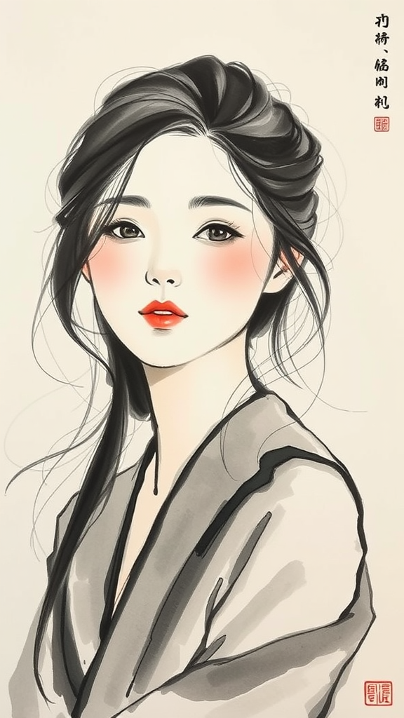 Ink painting depicting a young Korean woman aged 25-30, embodying Asian beauty standards, with an air of elegance and poise. The artwork features intricate brushwork, highlighting her delicate features and graceful expression. Set against a minimalist background, the painting captures a harmonious balance of tradition and modernity. The composition has a sense of dynamic energy with subtle, flowing lines that suggest movement, adding a layer of depth and character to the portrayal, while maintaining a serene ambiance.