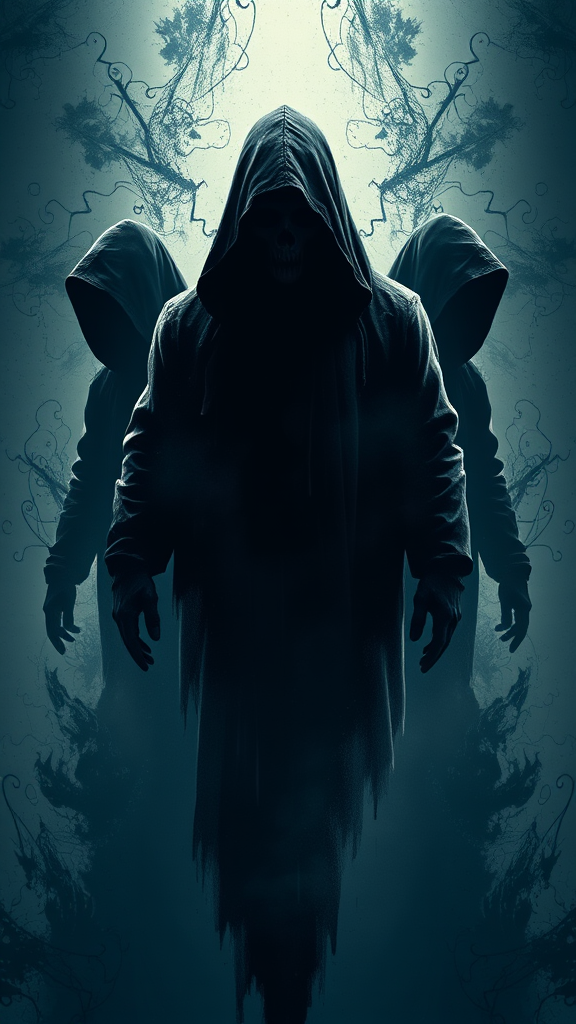 Inkblot pattern of five dark figures, inspired by a hooded reaper character from a popular video game, depicted in ultra-realistic and intricately detailed style, bathed in dramatic cinematic lighting, capturing an intense and atmospheric mood with a 3:2 aspect ratio.