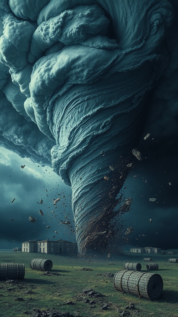 A tornado, inky as midnight, swirls menacingly across the expanse, scattering fragments of earth and sky, each particle captured in exquisite detail, a stunning opus melding realism and enchantment, hyper maximalist and rich in texture, evoking deep awe and wonder. This extraordinary depiction seamlessly fuses the raw power of nature with an artist's visionary eye, resembling a photograph where every element is meticulously crafted, creating an awe-inspiring spectacle that is both terrifying and beautiful.