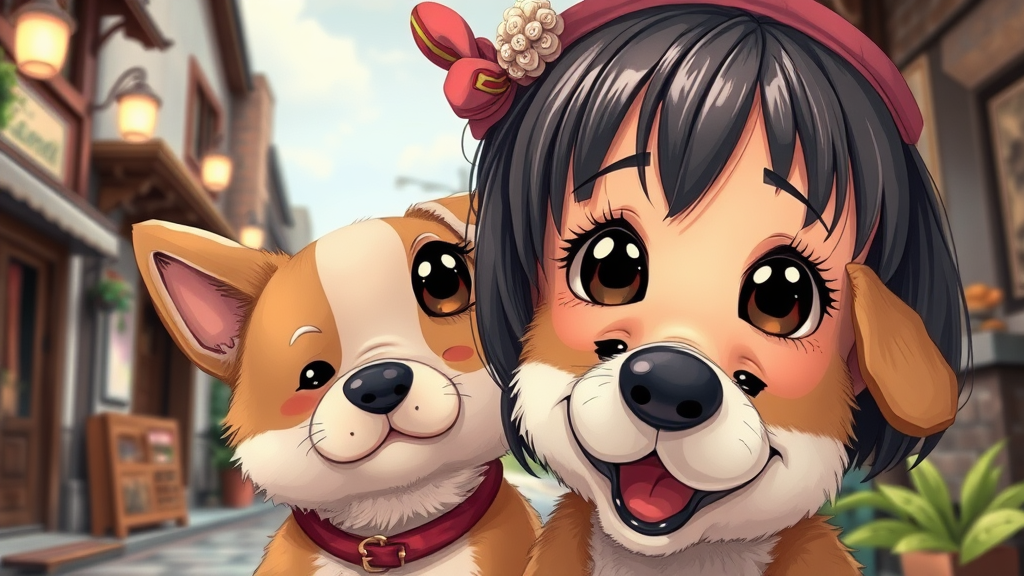 Insanely detailed close-up illustration of a cute little girl and her adorable dog in a village street, focusing on their expressions, capturing every intricate detail in a cartoonish vector style. Inspired by Hayao Miyazaki and Makoto Shinkai, this mix-media artwork uses soft colors in ultra-high resolution with sharp clarity. The scene highlights their big, expressive eyes and joyful demeanor, set against a serene village backdrop. Emphasizing artistic harmony and charm, this illustration is free from errors, emphasizing quality and creativity while steering clear of any distracting elements or imperfections.