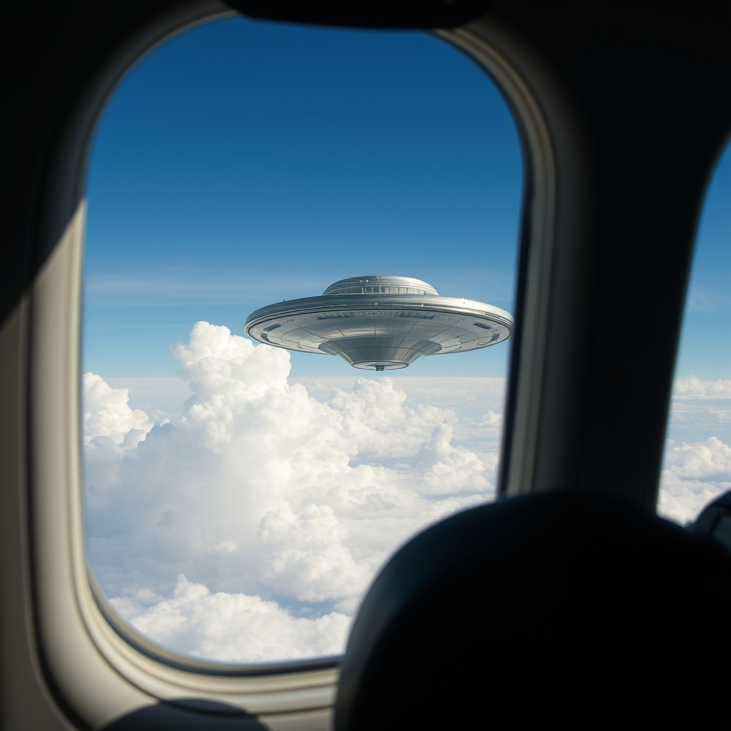 Inside a bustling passenger plane, sunlight streams through the cabin windows, where fluffy white clouds drift serenely against the endless blue sky. Glancing out through the narrow airplane window, a mysterious UFO hovers silently amidst the cloudscape, its metallic surface reflecting snippets of sunlight in an eerie display. In the foreground, the outline of seatbacks frames the scene, adding an ordinary contrast to the extraordinary sight beyond.