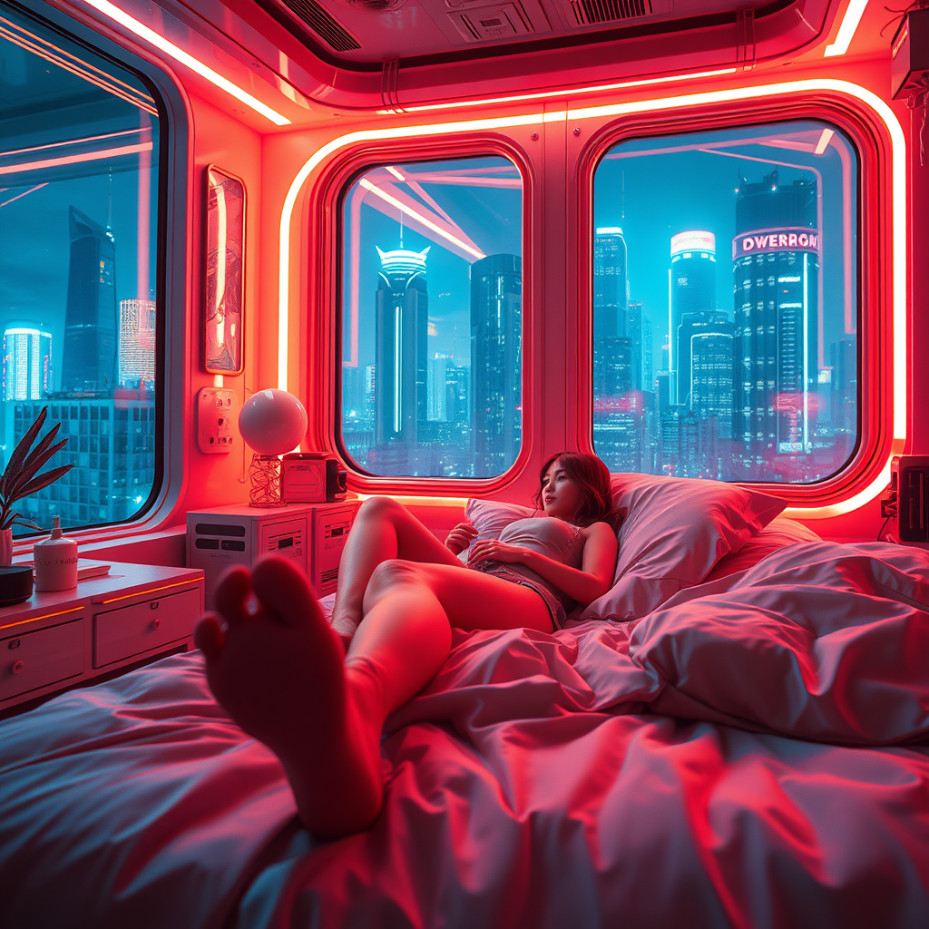 Inside a futuristic girl's room, the ambiance is a captivating blend of cyberpunk aesthetics with neon lights casting a vibrant glow. A girl lounges on her bed, surrounded by the photorealistic detail achieved through Unreal Engine 5. The window provides a breathtaking view of towering skyscrapers in the distance, adding depth to the scene. Inspired by deviantart, every element is highly detailed and sharply focused, creating a stunningly beautiful sci-fi tableau. The room exudes a dystopian elegance with iridescent gold accents and cinematic lighting that highlights the room's sleek, modern décor. While the atmosphere is mesmerizing, some elements seem slightly off-kilter—hands and feet are awkwardly drawn, with features subtly disfigured and forms just out of frame. The anatomy is imperfect with peculiar proportions. Despite these flaws, the scene captures the essence of a futuristic haven with a unique artistic touch.
