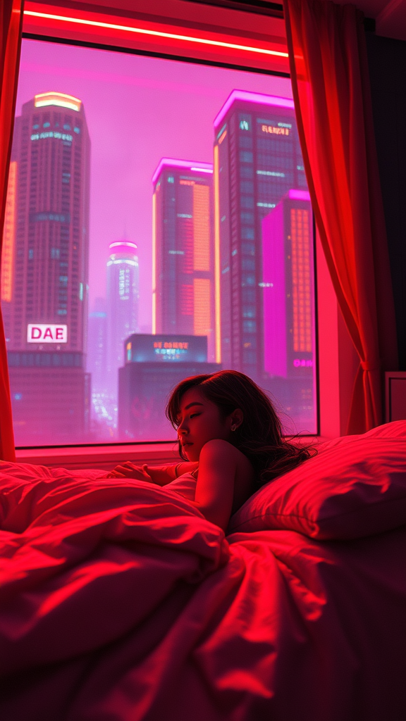 Inside a girl's room, a captivating cyberpunk ambiance envelops the space with neon lights casting a vivid glow. The scene is captured with sharp focus and a photorealistic touch reminiscent of Unreal Engine 5. A girl is laying on the bed, her face serene against the backdrop of towering skyscrapers visible through the window. The atmosphere channels a deviantart aesthetic, beautifully detailed with sci-fi elements. The lighting is cinematic, creating an iridescent gold hue that contrasts with the dark, gritty undertones of the dystopian setting. The space is meticulously arranged, every element narrating stories of a futuristic world. Despite the dark themes, the composition is stunningly beautiful, evoking a sense of wonder and intrigue.