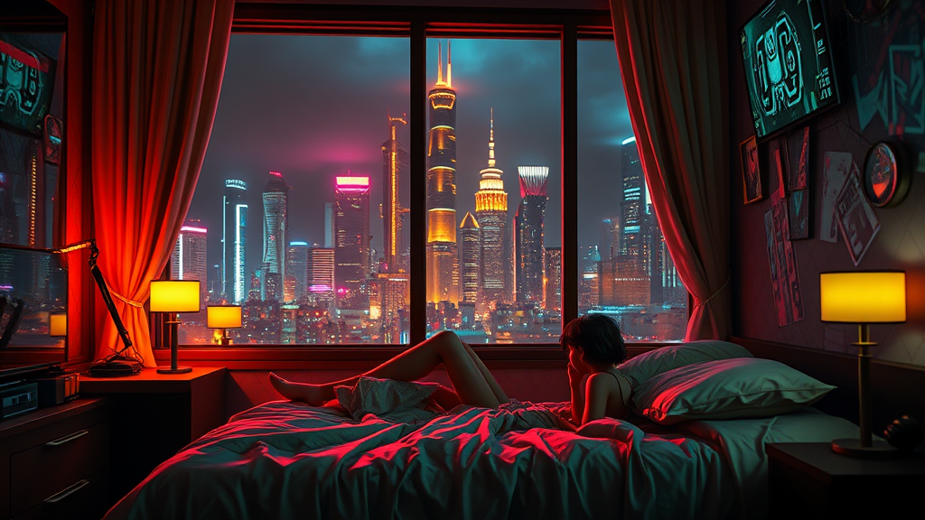 Inside a girl's room, an intense cyberpunk vibe permeates, with neon glowing lights casting dynamic shadows and reflections. Through the window, towering futuristic skyscrapers stand against a darkened skyline, creating a contrasting backdrop. The girl reclines on her bed surrounded by vivid iridescent gold hues, her surroundings are rendered in stunning photorealistic detail using Unreal Engine 5. The ambiance is a blend of dystopian beauty and cinematic lighting, with the room showcasing a sharp focus that highlights its intricately designed elements. DeviantArt-inspired, the scene exudes a sci-fi essence, beautifully capturing the essence of a futuristic urban sanctuary.