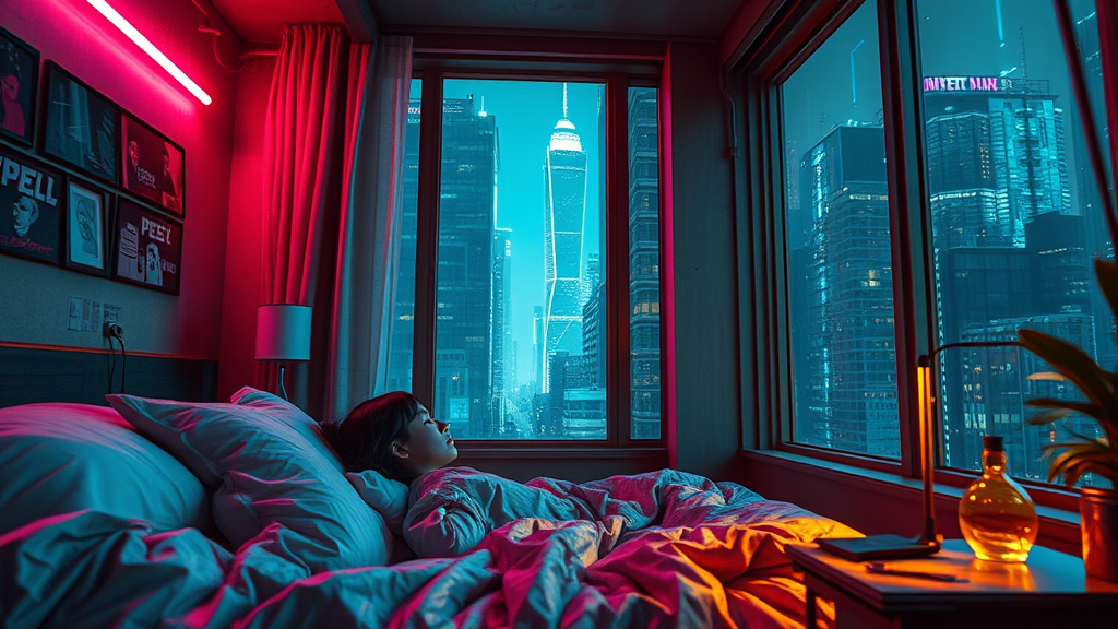 Inside a girl's room with a cyberpunk vibe, neon lights cast an iridescent glow, enhancing the stunning detail created in an ultra-realistic style reminiscent of Unreal Engine 5. The girl, resting on her bed, is partially illuminated by the cinematic lighting from a nearby window that showcases the towering skyscrapers beyond—a scene filled with deviantart-level intricacy. The atmosphere blends sci-fi beauty with dystopian elements, using richly textured, gold-hued contrasts. While retaining focus on the intricate design, there's an artistic complexity with subtly distorted reality: fragmented reflections, unexpected angles, and a slight surrealism that distorts proportions, evoking the essence of a dreamlike, futuristic world.