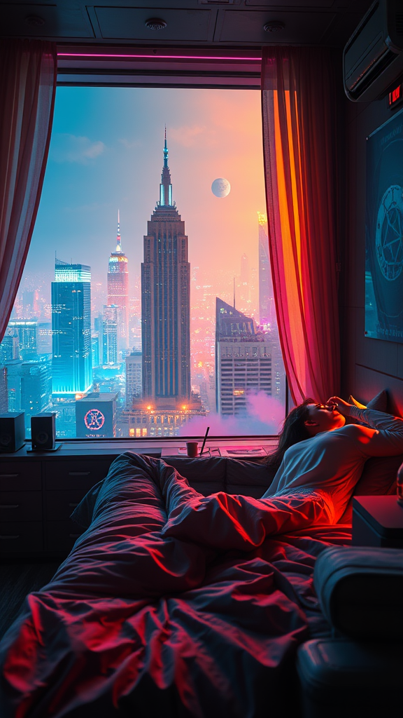 Inside a girl's room with a vivid cyberpunk vibe, neon lights cast an iridescent glow throughout the space. The scene is sharply focused and photorealistic as if rendered in Unreal Engine 5. The girl is lounging on her bed, surrounded by the high-tech ambiance, while a large window offers a breathtaking view of towering skyscrapers in the distance. The room is a masterpiece of detail, inspired by DeviantArt; every corner is meticulously designed, capturing the beauty of a dystopian world. Radiant gold highlights add a touch of elegance amidst the sci-fi setting. Cinematic lighting enhances the room's aura, creating an artistic yet dark atmosphere. While the focus remains on the captivating environment and its mood, the composition avoids technical faults like poorly drawn features or awkward anatomy, ensuring the scene stays immersive and stunning.